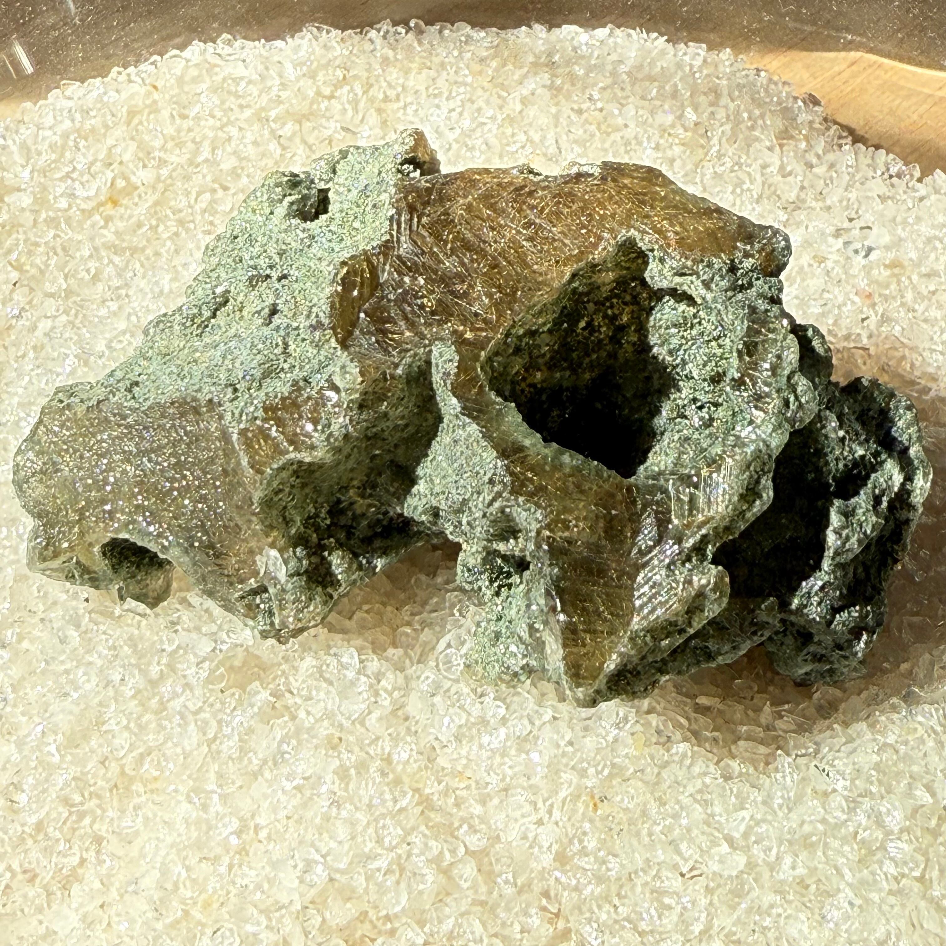 ルチルクォーツの表面にモスグリーンのクローライトが共生している